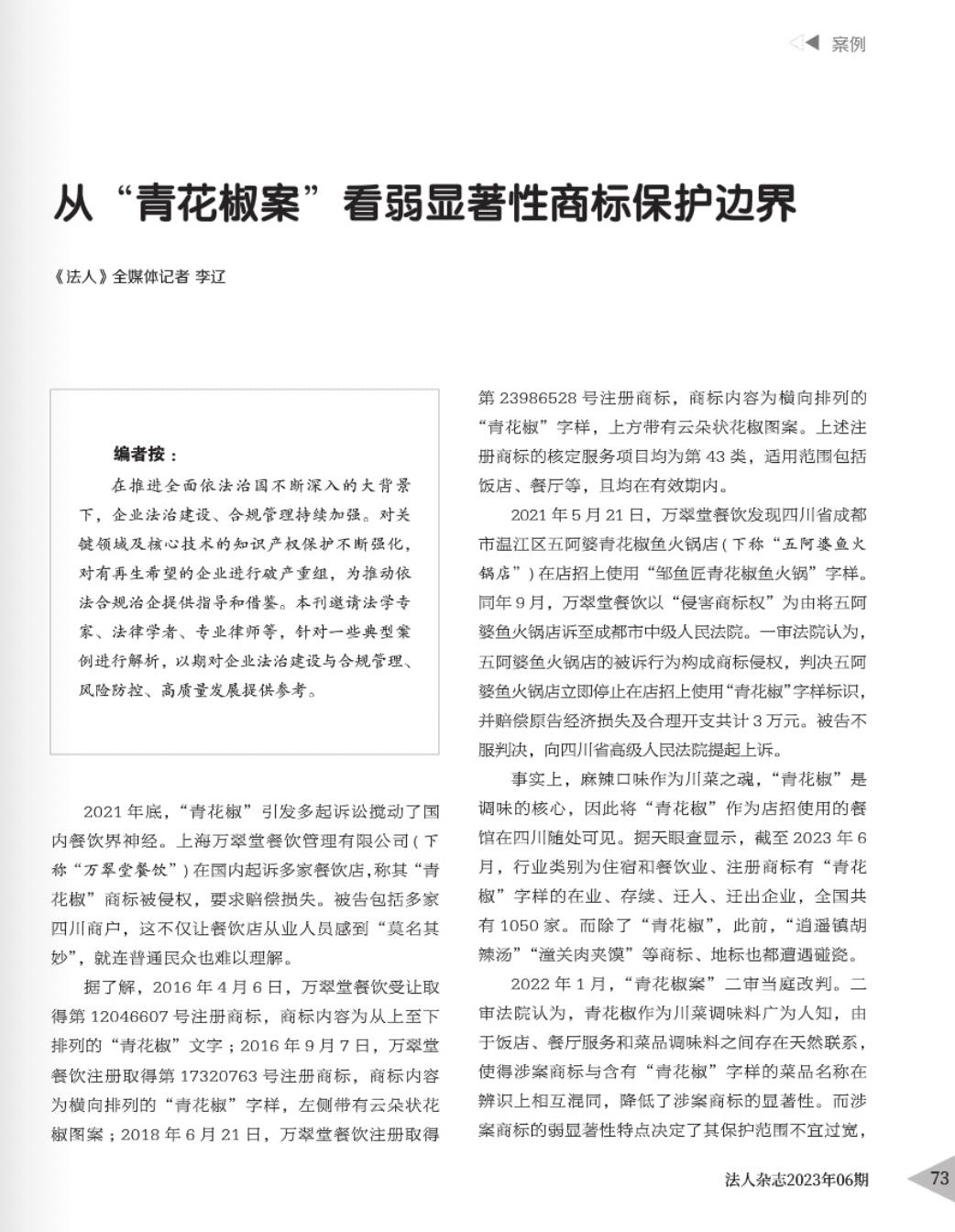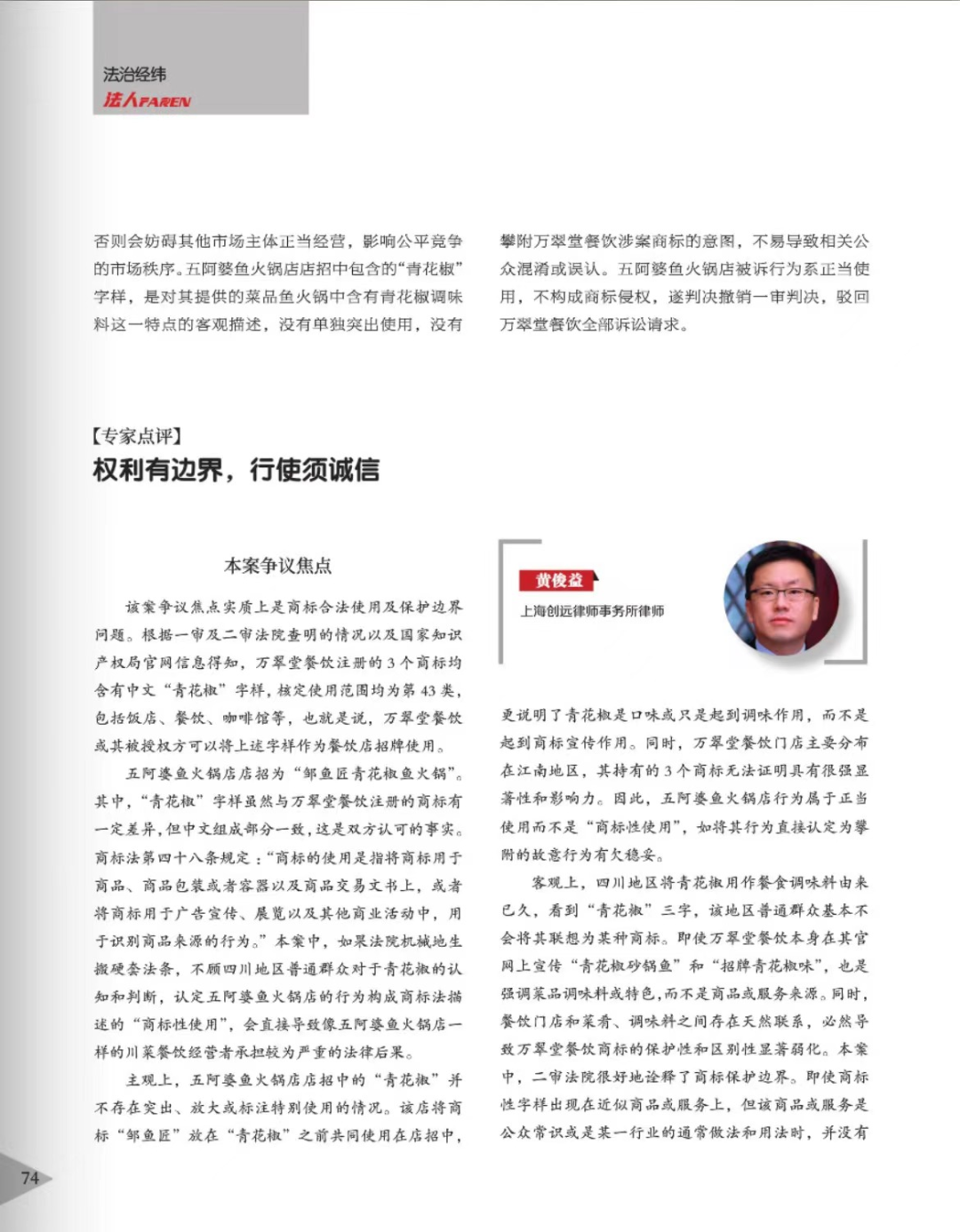 黑龙江辉知简讯 | 辉知队黄俊益律师应“法治日报”旗下杂志邀请,就“青花椒”案发表专家点评